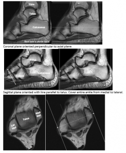 Sagittal plane oriented with line parallel to talus. Cover entire ankle from medial to lateral.