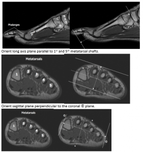 Orient short axis plane parallel to 2nd/3rd metatarsal shaft.