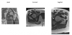 Orient coronal parallel to the femoral heads.