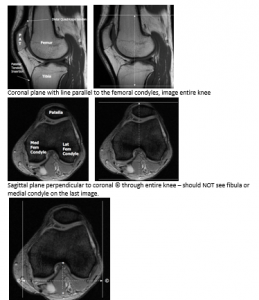 Sagittal plane perpendicular to coronal © through entire knee – should NOT see fibula or medial condyle on the last image.
